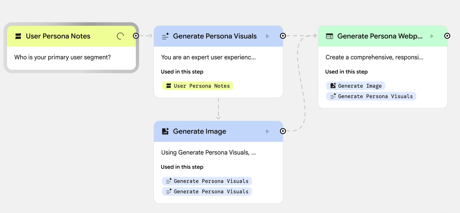 Opal then generated this workflow that includes 4 steps: user input, image generation, persona visuals and an entire webpage that puts it all together.