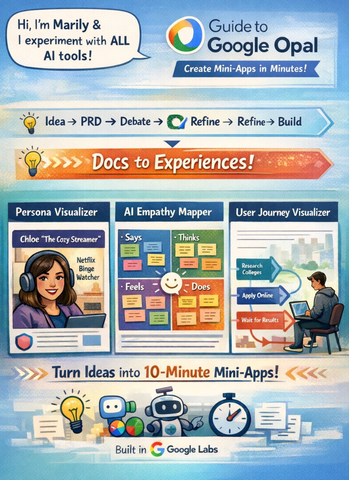 If there’s one tool every PM should start with, it’s Opal, it’s fastest way to prototype the vibe. Opal lives in Google Labs and lets you describe what you want in natural language — “an empathy map builder,” “a quick journey visualizer,” “a competitor snapshot” — and it assembles the app for you. There’s no setup, no code nor hosting needed. You end up with small, functional apps — what I call 10-minute tools.
