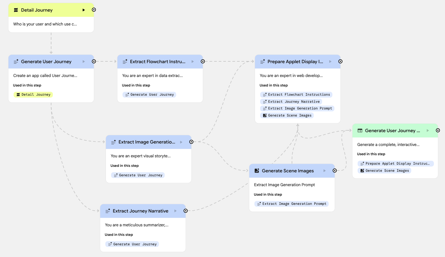 The workflow that was generated is a bit more complicated because Opal realized it needs several different roles to achieve our goals, that of a ‘visual storyteller’, ‘meticulous summarizer’ among others, in order to generate the final user journey.